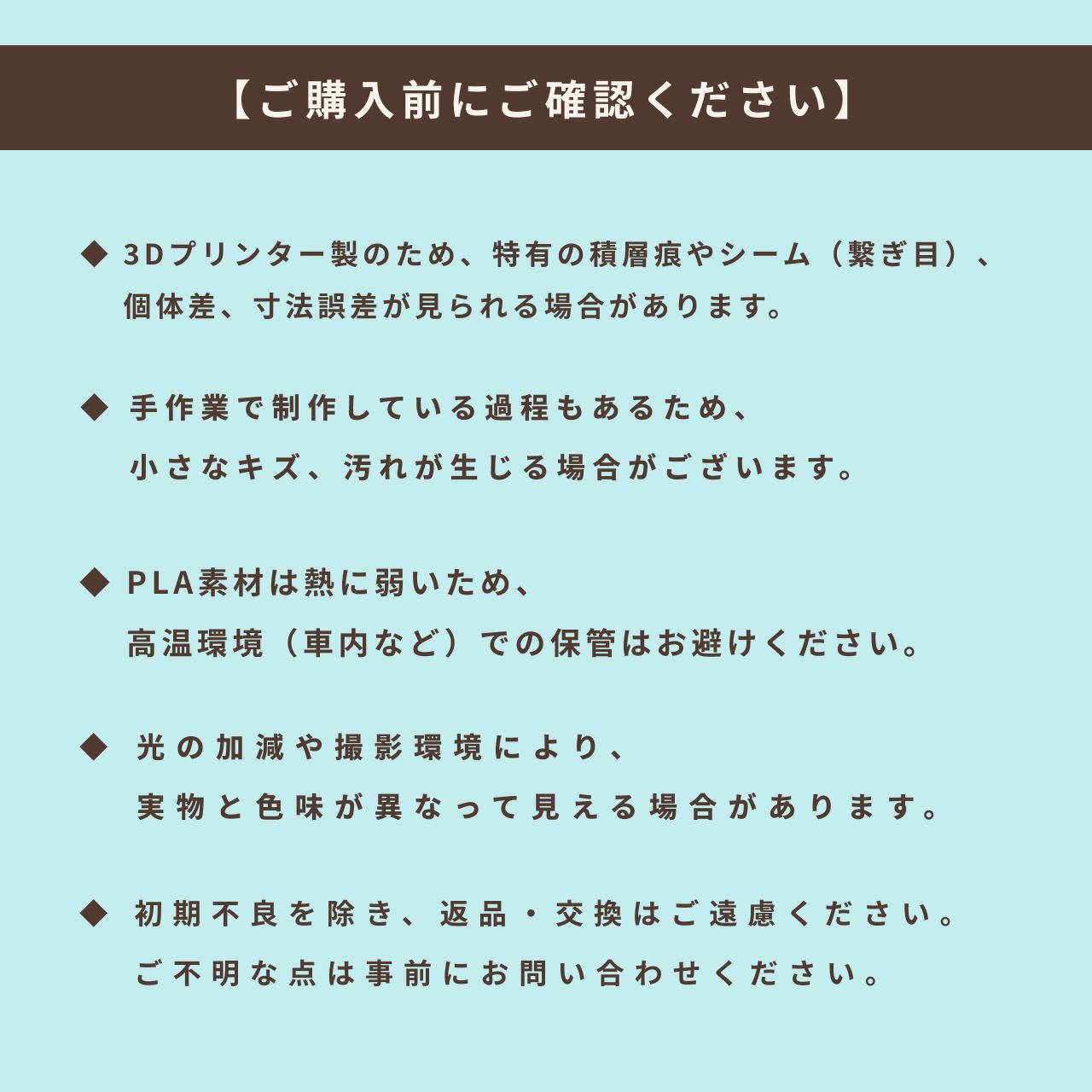 ■3Dプリンターの性質上や家庭用3Dプリンターを使用しているため工場生産の製品よりも寸法値から誤差が出やすい事や、なるべく目立たない様に設計しているものの、3Dプリンター特有の積層痕やシームが見られる場合がございます。