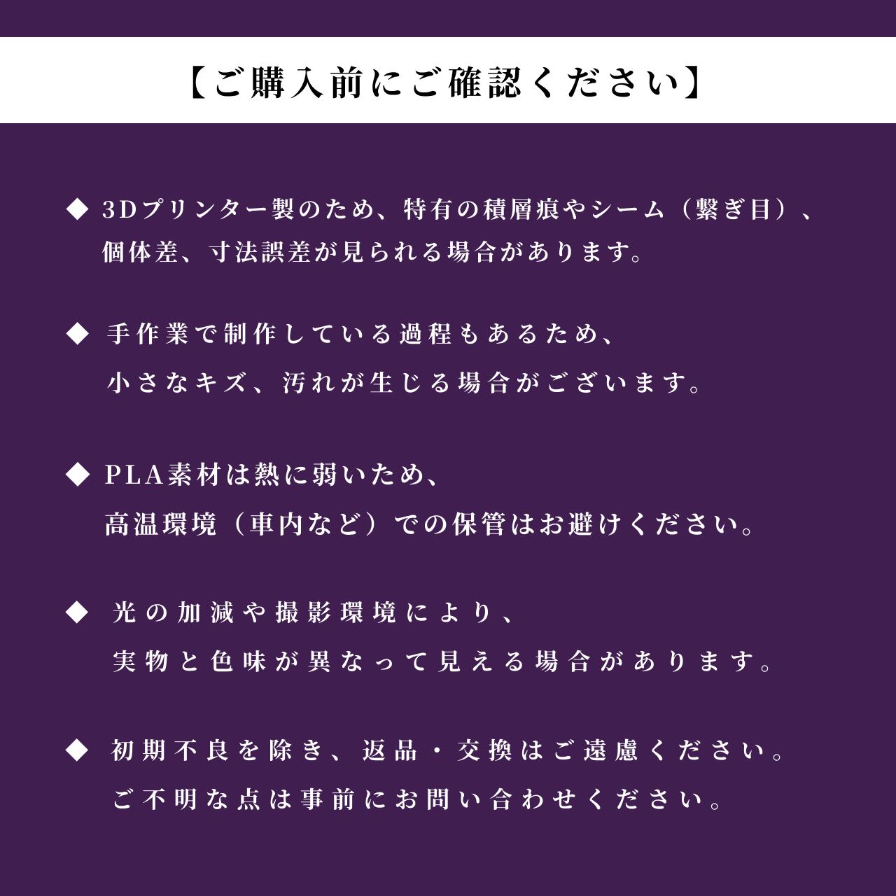 ■3Dプリンターの性質上や家庭用3Dプリンターを使用しているため工場生産の製品よりも寸法値から誤差が出やすい事や、なるべく目立たない様に設計しているものの、3Dプリンター特有の積層痕やシームが見られる場合がございます。